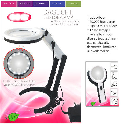 Loeplamp LED oplaadbaar 13 cm. oplaadbaar voor patchwork, borduren, schilderen enz...12 high brightness LEDs, voor 60 000 branduren. Zowel staand als draagbaar te gebruiken. Hoofdlens : 13 cm vergroot 2x Hulplens : 2,50 cm vergroot 4x Energiezuinige LEDs Inclusief High performance 1,5 AA batterijen goed voor 8 uren onafgebroken verlichting. Plug-in met xxl snoer van 3 meter. Let op dat als u de loeplamp niet gebruikt, u deze niet in de zon plaatst. Dit levert brandgevaar op wanneer zonlicht door de lens valt. Dek de lens af bij het niet gebruiken.