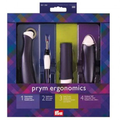 Prym Geschenkset Ergonomics. Geschenkverpakking met ergonomische artikelen. Bestaat uit: Radeerwiel, Tornmesje fijn, Draaibare naaldenverdeler, Krijtradeerwieltje