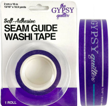 Seam Guide Washi Tape van Gypsy Quilter. De zelfklevende naadgeleider van The Gypsy Quilter® is perfect voor huishoudelijke naaimachines. Knip de tape eenvoudig op de gewenste lengte en plak hem op het bed van uw naaimachine om richtlijnen voor het naaien te creëren. Lijn de middenlijn van de tape uit met de naald van uw machine om richtlijnen te creëren voor naadtoeslagen van 1/4" en meer. Nooit meer naailijnen tekenen voor halve driehoeken. Om te voorkomen dat er resten op uw machine achterblijven, raden we aan de tape tussen projecten te verwijderen. Afmeting 3/4"x 10 yards.