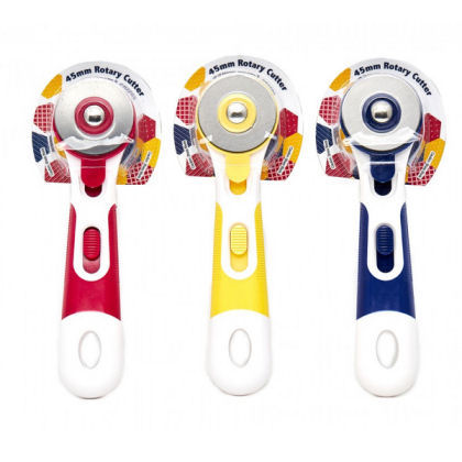Rotary Cutter 45 mm. Scherp recht mes, ideaal voor het snijden van meerdere lagen stof en papier. Ergonomisch ontworpen zachte handgreep en veiligheidsvergrendeling beschermt het mes wanneer het niet in gebruik is.