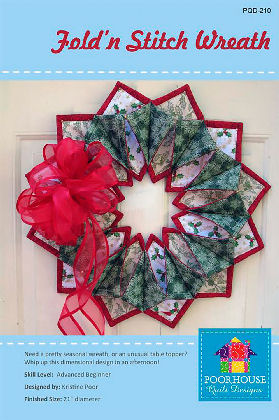 Fold'n Stitch Wreath. Engelstalig patroon om deze leuke dimensionale krans of een leuke tafel topper te maken- u beslist! Doorsnede 21"diameter. Duidelijke beschrijving met foto's. Makkelijk genoeg om in één middag te maken. Enkelzijdige plakbare steunstof nodig, zie onze Bosal producten. Lijst met benodigdheden te vinden op http://poorhousequiltdesign.com/wp-content/uploads/2015/11/Supply-List-PQD-210-Web.jpg