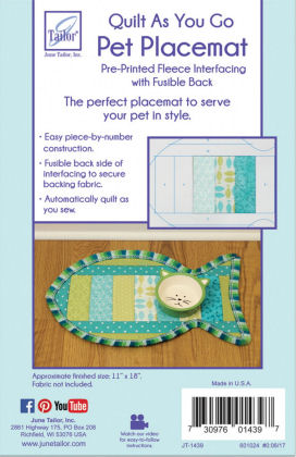 Quilt As You Go Pet Placemat Cats. Kattenliefhebbers kunnen aangepaste placemats maken voor hun harige vrienden en hun vloeren beschermen tegen krassen en spatten. Eenvoudige Engelstalige stuk-voor-aantal constructie. Smeltbare achterkant van de interfacing om de backing-stof te beschermen. Automatisch quilten terwijl u naait. Geschatte voltooide afmeting: 11" x 18" (28 cm x 46 cm). Stof niet inbegrepen. Gemaakt in de VS