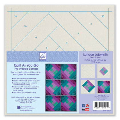 Quilt As You Go Quilt London Labyrinth. Maak dit London Labyrinth-quiltpatroon met de Quilt As You Go Pre-Printed Batting. Bevat zes 12 "-afmetingen blokken voor een 24" x 36 "quilt en is perfect voor gebruik met voorgesneden 2-1/2" stroken. Bevat zes 12 "-afmetingen voor een 24" x 36 "quilt. Gebruik meer blokken voor een groter formaat quilt..Eenvoudig stuk-op-nummer constructie. Het blok wordt tijdens het naaien automatisch gewatteerd. Vulling van 80% katoen, 20% polyester. Gemaakt in de VS. Zie filmpjes op youtube.