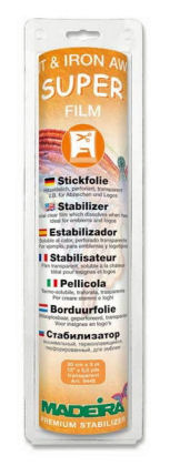 Cut Away Super Film van Madeira, 0.3 m x 5 m, transparant. Super Film is een hittegevoelige speciaalfolie die bij heet strijken oplost. Super Film is geperforeerd en daardoor uitstekend geschikt voor het opstikken van insignes, omdat het motief gemakkelijk en netjes losgescheurd kan worden. Ten opzichte van wateroplosbare folies heeft Super Film het voordeel dat ook watergevoelige stoffen (zoals bijvoorbeeld fluweel, moiré-stoffen) bewerkt kunnen worden. Ideaal voor machineborduren, borduren van kantwerk (etsborduurwerk), logo's en insignes.